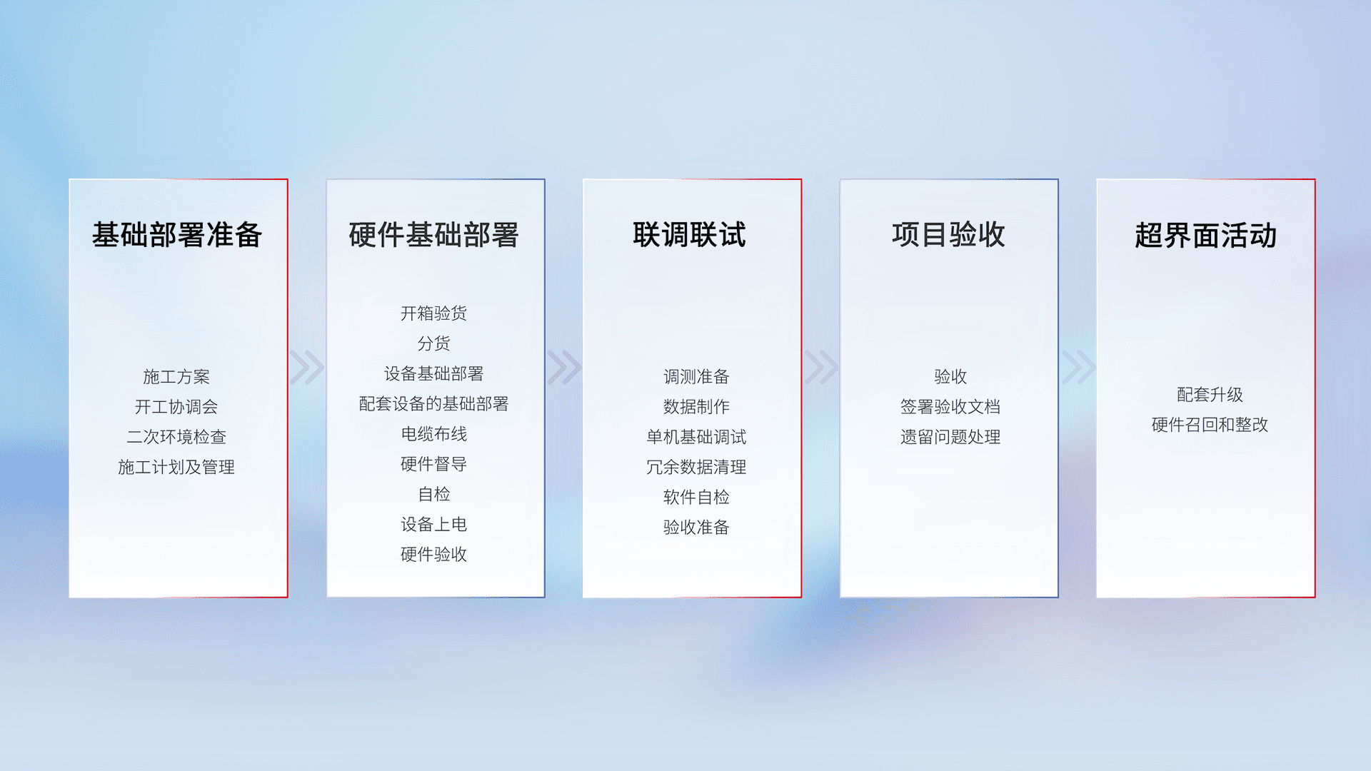从基础部署准备、、、硬件基础部署、、、、联调联试、、、、项目验收、、越界面活动的全过程可追溯,,,,保证施工质量和进度。。。。
