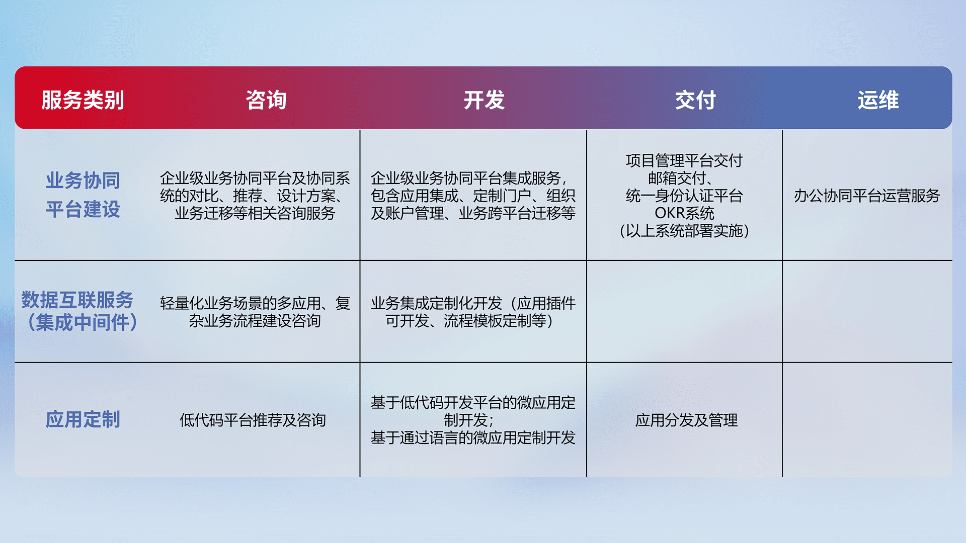 针对钉钉、、、企微、、、、IDaas等平台级产品提供产品的规划、、、、方案、、、、交付、、、、定制化开发等服务,,,实现如统一协同办公、、、智能客户服务、、、、混合会议管理、、、、智能数据查询、、、等业务场景,,,实现数字化转型。。